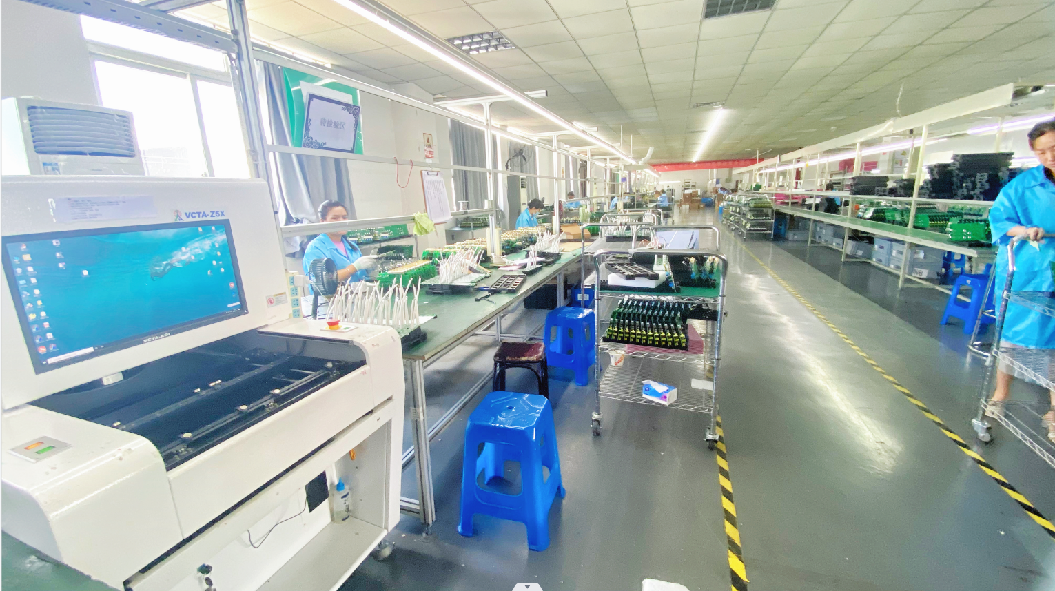 我们拥有2条全自动SMT贴片加工生产线及2条专业的插件流水线,贴片能力达到日产400万点,插件可到25万点,现有员工40人左右,其中管理人员在SMT行业都有5-8年的经验,且有团队对设备快速响应维护,让产能损失降到最低。